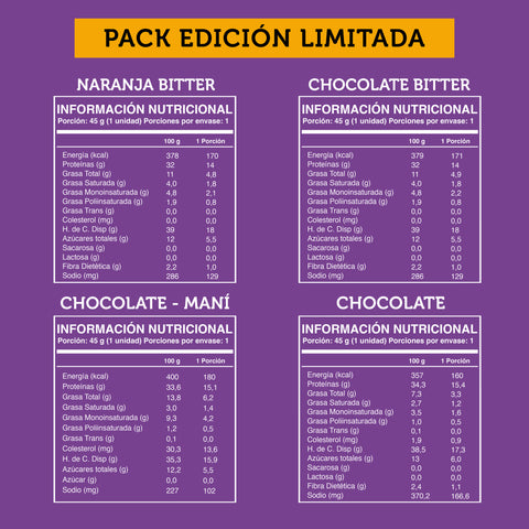 - Chocolate Naranja: Pasta de dátil (20%), proteína aislada de soya, fibra de achicoria, proteína aislada de arveja, licor de cacao (11%), pasta de maní, cacao en polvo, almidón de tapioca, saborizante natural.