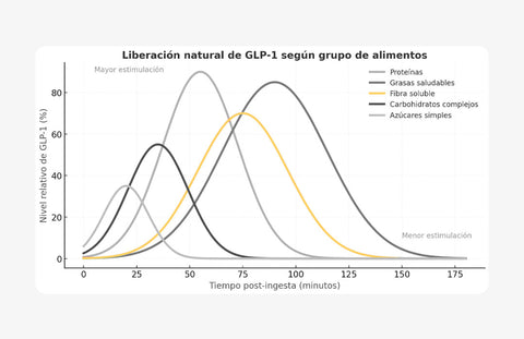 El consumo adecuado de fibras prebióticas, especialmente las solubles, cumple un rol clave en la liberación natural de GLP-1. Al llegar al intestino, estas fibras son fermentadas por la microbiota intestinal, generando ácidos grasos de cadena corta (AGCC) como el butirato, propionato y acetato. Estos metabolitos estimulan las células L intestinales, promoviendo una mayor secreción de GLP-1.
